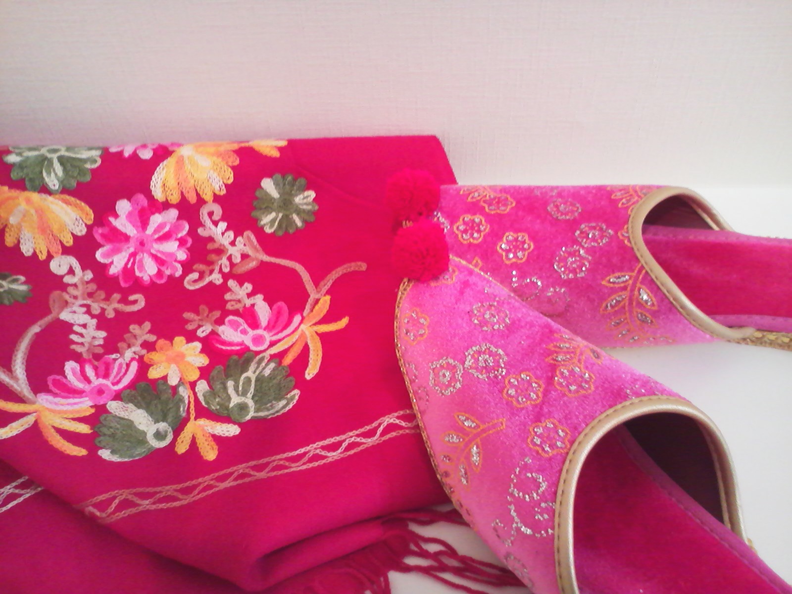 母からのお土産は、お花の刺繍がたっぷりと施されたストールとぼんぼりスリッパ。
