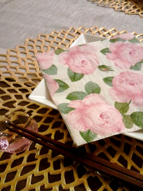 お友達夫妻と… 我が家でお食事です♪お友達の好みに合わせてローズのナプキンにしてみました。★献立メモ★エビとアボカドのマリネホタテのサラダ蒸し野菜 バーニャカウダソース鶏団子と蕪のお椀仕立て油淋鶏蛸の炊き込みご飯