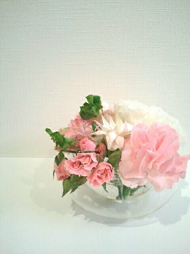 mini arrangement. お友達からいただいたブーケ。まだまだ頑張ってくれています(*^-^*)弱ってしまった茎を落として、スガハラ風の器に挿してみました☆こちらの器は、花器としても食器としても使えてとても便利。お友達にも好評です…♪