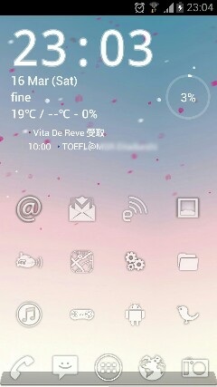 スマホ画面も♪ 春らしくカスタマイズしました☆Androidは画面をいじれるので、飽きがこなくて本当にありがたいです。バッテリー残量、お天気、今日の予定が視覚的にぱっと見られるところがおきにいり・・・♪さて、遊ぶのをやめて寝なくちゃ〜(x_x)